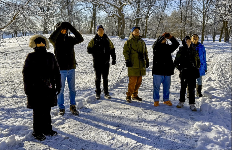The Martin Luther King Jr. Birthday walk was Jan. 19. The day before the snow kept falling and I was having a tough time deciding whether or not to cancel the walk. Paths and walkways can become icy. Snow covers the small depressions in the trail and tree branches that have fallen become hiddden, making tripping a possibility. In addition, it was going to be 25 degrees. After speaking with Joe, we decided we'll go ahead with the walk. If we got there in the moring and it was dangerous, we would all go home. At 9:00am it was not icy, just snowy. The footing was fine and it was very beautiful, the snow outlining the trees and branches in the Pelham Bay Park woods. We saw 26 species including two Bald eagles, a variety of ducks and a bunch of passerines. As usual, we stopped at the swinging gate on Hunter island and watched the antics of the Red-bellied Woodpecker, Downy, Nuthatch, Titmouse and other species as they vied for the seed left behind. I was really glad we decided to have the walk.